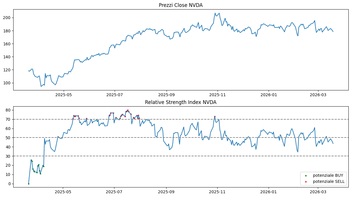 L'RSI misura la velocità e l'ampiezza dei cambiamenti di prezzo su un periodo (default 14 giorni). Oscilla tra 0 e 100. Valori sopra 70 segnalano ipercomprato, sotto 30 ipervenduto.
