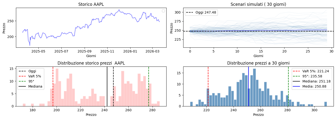 Costruisci un grafico plotly a 4 pannelli per un titolo a tua scelta (periodo 6 mesi):